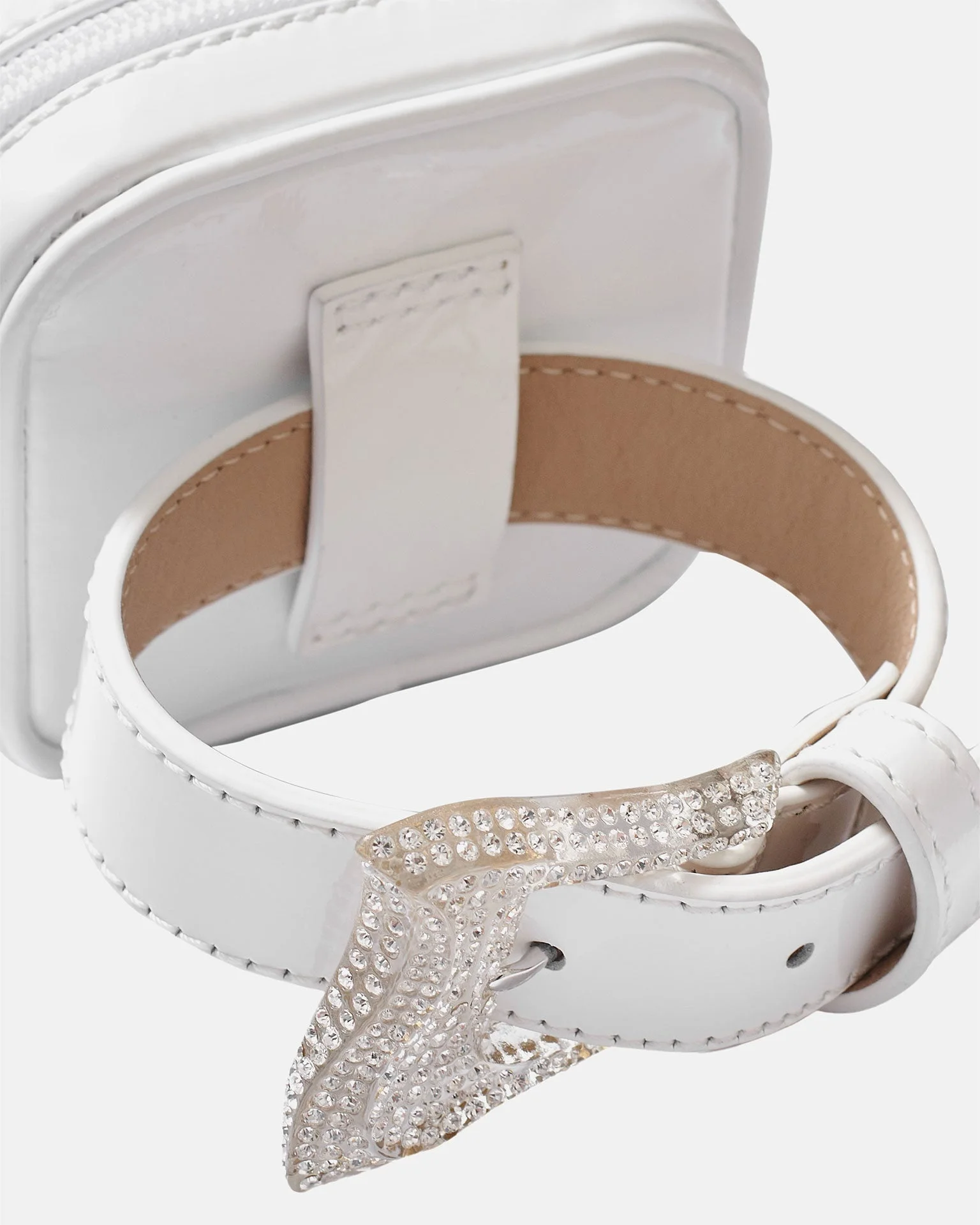 The Haus Purse Belt is the perfect accessory this season. The belt can be adjusted for the perfect fit and features our iconic custom resin diamante buckle & a petite zipped pouch to stow only the small essentials. Hand crafted in London in the SS24 exclusive colour way 'Virgin White', the Haus purse was designed to make an outfit statement. As worn by Alana Champion in our SS24 campaign. - 100% patent leather - Custom diamante encrusted buckle