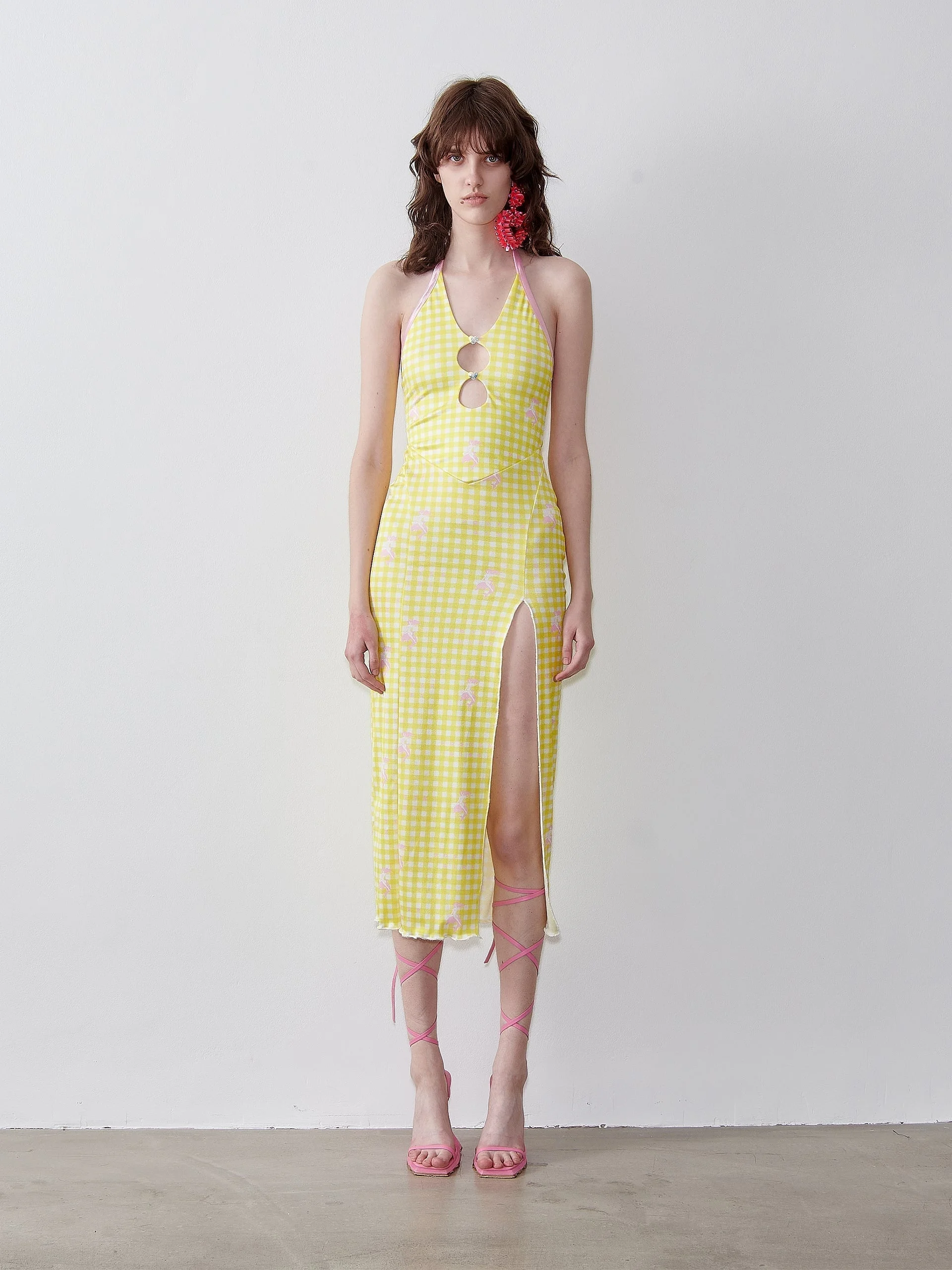 Dive into the exclusive POSTER GIRL POOLSIDE collection with the Heather Midi Dress. The midi dress is crafted in luxurious powermesh and debuts our iconic POOLSIDE gingham logo print. The Heather Dress features our signature cut out crystal heart detailing and long adjustable back tie. Finished with a high rise split and lettuce hem edging the Heather Dress is the perfect from poolside to the dance floor. - 95% Elastane 5% Polyamide - Model Height: 5'9"/ 175cm and wears size S