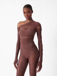 Our new long Rhinestone Ivy Jumpsuit is uniquely designed with asymmetric cut out details and contrasting textures. This jumpsuit features an off-shoulder detail to expose the decolletage and longer length leggings. POSTER GIRL's shapewear category is designed to suction you in all the right places, releasing and supporting your natural curves where needed. Always remember, the brand logo is stamped into the lower back of all shapewear designs as POSTER GIRL's mark of authenticity. - The jumpsuit is one size and can stretch from a UK size 6 - 18 - 98% Polyamide 2% Spandex - Model Height: 5'9.5"/ 176cm