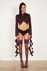 The Judy Jacket fuses modern classic tailoring with a POSTER GIRL twist. Tailored for a structured slim fit this cropped jacket features an asymmetric hem and collarless neckline & can be buttoned or worn open. Designed with shoulder padding for a defined look this statement making jackets pairs perfectly with the matching Rapunzel hot pants. As seen on JT in the SS24 campaign. - Two buttoned fastening - Asymmetric hem - Cropped jacket length - Model Height: 5'6" / 172cm and wears size S