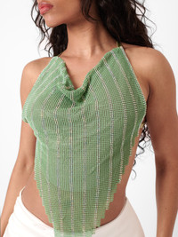 Our iconic Beyan top is back due to popular demand in an exclusive new striped chainmail. Crafted from a matte green chainmail with rhinestone stripe detailing, our intricate Beyan top features a high cowl drape neckline and adjustable cross over back straps with heart sliders. Handmade in London with each sheet of chainmail cut, linked and sewn together by hand to achieve the perfect slink. - Made from luxurious aluminium metal - Cowl Neck - Adjustable straps - Fully lined with logo stretch mesh - Models wear size S - Model Height 1: 5'6" / 168cm Chainmail is unlike most fabrics so it is important to take care when trying on. Chainmail ranges from XS-XL and does not stretch. Never force the garment on otherwise the chainmail will rip. If you are in-between sizes, we recommend sizing up. COMPOSITION & CARE - 50% Aluminium 50% Glass