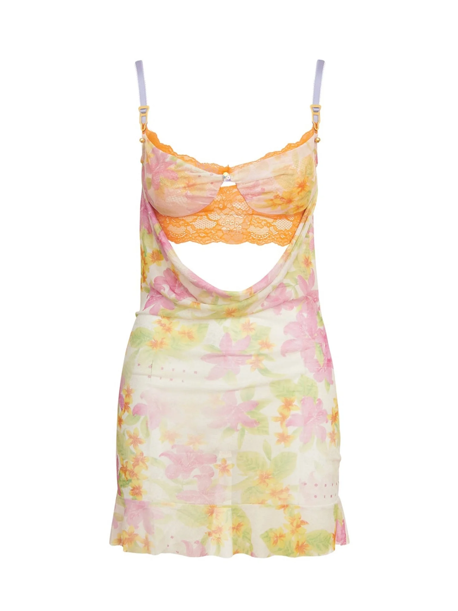 The Lynette Dress is back for AW22 in a brand new colour way. The semi-sheer mini dress is crafted in London from our luxurious logo print stretch mesh. Featuring a flattering front and back cowl drape and frilled hem, the Lynette Dress highlights your curves and flatters your frame. With super soft lace bra detailing, supportive underwire and adjustable straps with silver-plated hardware, the Lynette is the sweetest dress for this season. - Outer: 93% Polyamide 7% Elastane - Lining: 88% Polyamide 12% Elastane