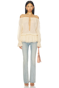 - 90% Silk 10% Spandex - Machine wash delicate - Off-shoulder styling with elastic neckline and tie closure - Unlined - Elastic cuffs and hem with tiered ruffle detail - Garment is intentionally sheer, undergarments will show through - Please note undergarment not included - Neckline to hem measures approx 24.5" in length - Revolve Style No. PGIR-WD90 - Manufacturer Style No. AW25RTWDR036