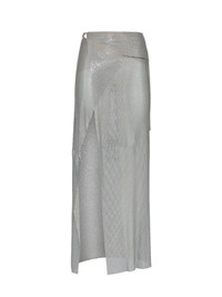 The Pamela Show Skirt is crafted from our micro metal-mesh and wraps with ease around the waist into an asymmetric full length hem.Designed to sit at your natural waist, custom fastenings & chain allows the wearer to adjust the fit accordingly. - Partially lined in POSTER GIRL logo mesh - Outer: 100% Aluminium - Lining: 93% Polyamide 7% Elastane