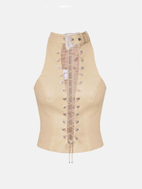 Our signature Phoebe is back in an exclusive hue for SS24. Crafted in London, this plunging corset top has been made with faux leather and features our iconic custom buckle, updated with this seasons diamantes, metal eyelets, back zip and elasticated front lacing. Designed to cinch and enhance your cleavage, the Phoebe top is guaranteed to turn heads! - Soft faux leather - Medium resin custom diamante encrusted buckle - Adjustable neck strap - Adjustable lace up front - Metal heart eyelets - Center back zipper - Model Height: 5'6" / 172cm and wears size S