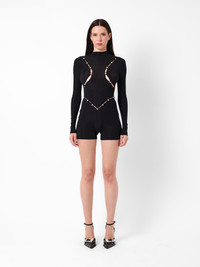 This body-skimming playsuit has been designed to accentuate your body in all its glory. Cut from a semi sheer gloss fabric, this long-sleeved playsuit features sexy cutouts with rhinestone heart detailings. Pair with the Cruella Shoes and Whorne Bag for the complete look. - Semi sheer gloss fabric - Cut outs with rhinestone heart detailing - Long sleeves - Center back zip - Model wears size XS - Model Height: 5'8.5" / 174cm