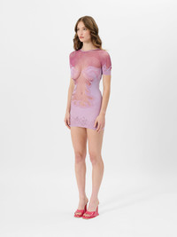 Designed in a two tone coloured fishnet, the Pin Up Dress features unique flame-detailing that contours and accentuates your silhouette. This shape defining mini dress is a hot classic and can be paired with Ursula Mules in Patent Pink for that statement making look. Always remember, the brand logo is stamped into the lower back of all designs as POSTER GIRL's mark of authenticity. The dress is one size and can stretch from a UK size 6 - 18 - Model Height: 5'8" / 176cm