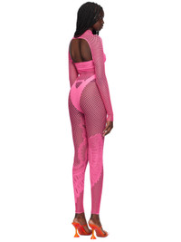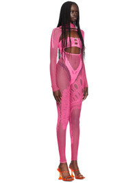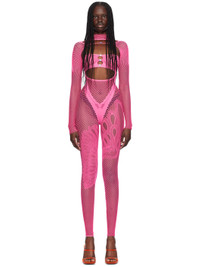 Semi-sheer stretch nylon-blend jersey and fishnet jumpsuit. Graphics and pointelle knit detailing throughout. · Sweetheart neck · Crystal-cut graphic hardware and cutouts at front · Jacquard logo at back · Detachable bolero-style overlay Supplier color: Pink 45% polyamide, 43% polyester, 12% elastane. Made in Italy 242770F070031