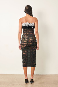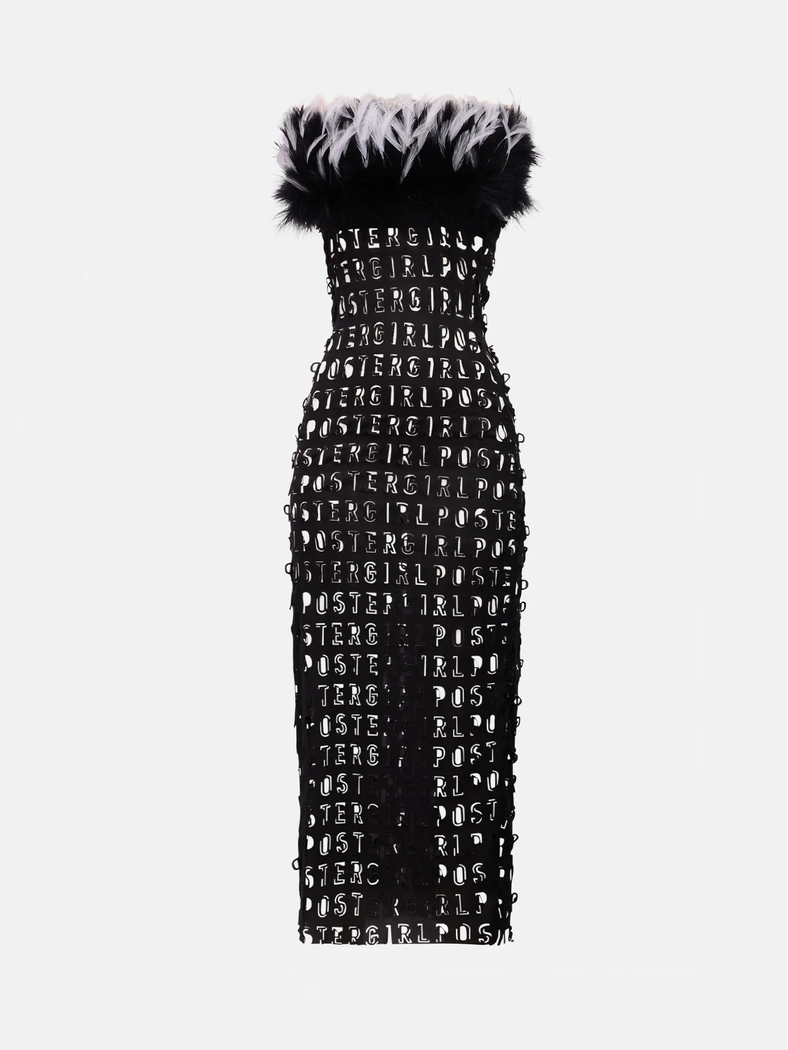 Spread your wings in our Posh Dress. Features our custom PG laser cut powermesh fabric, with a removable maribou feather bandeau that fastens with buttons on the side. It's midi length, stretchy and designed without a zip for a slim tight fit. - Midi length custom PG laser cut powermesh fabric - No zip - stretchy - Removable maribou feather bandeau buttoned at side - Model wears size S - Model Height: 5'11 / 180cm