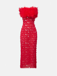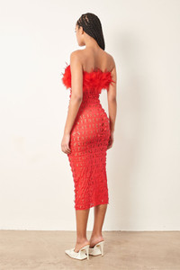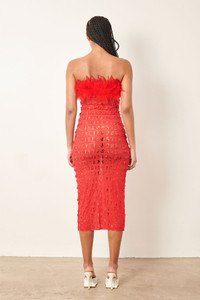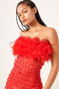 Spread your wings in our Posh Dress. Features our custom PG laser cut powermesh fabric, with a removable maribou feather bandeau that fastens with buttons on the side. It's midi length, stretchy and designed without a zip for a slim tight fit. - Midi length custom PG laser cut powermesh fabric - No zip - stretchy - Removable maribou feather bandeau buttoned at side - Model wears size S - Model Height: 5'11 / 180cm
