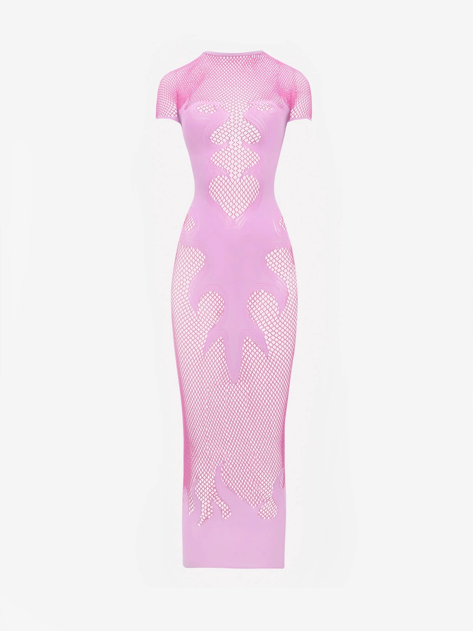 The bestselling Peachy Dress is back in a new spring / summer '25 two tone lilac colour way. Meticulously crafted with flame details and fishnet elements that contour and sculpt the body to achieve that perfect silhouette look. Elevate your wardrobe with this must-have piece. Always remember, the brand logo is stamped into the lower back of all designs as POSTER GIRL's mark of authenticity. - The dress is one size and can stretch from a UK size 6 - 18 - Model Height: 5'7"/ 174cm