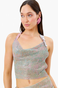 Description The Bambi Top has forever been our signature statement top. Crafted in London in heavy weight Mirage and Amethyst crystal chainmail, the top features a flattering cowl drape neckline construction. Luxurious leather straps secure the top with adjustable plush bra straps for the perfect fit. Finished with our iconic dazzling diamante buckle, engraved with our logo. Fully lined with logo stretch mesh. Pair with the Winona Wrap Skirt or layer with our brand new SS23 shapewear. - Made from aluminium metal with a stretch lining - Adjustable leather shoulder straps - Three way wear - Diamante buckle engraved with logo Composition & Care Outer: 100% Aluminium micro metal mesh Lining: 93% Polyamide 7% elastane Cool hand wash only Do not bleach Do not tumble dry Do not iron Each chainmail piece is constructed by hand in London. Chainmail is unlike most fabrics so it is important to take care when trying on. Chainmail ranges from XS-XL and does not stretch. Never force the garment on otherwise the chainmail will rip. If you are in-between sizes, we recommend sizing up.