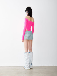 The Mia Mico Skirt is for the brave hearted. A brand new style from our AW22 collection. This ultra mini skirt is designed to sit on the hips with a dramatic mini-grazing hem, capturing the nostalgia of Y2K. With two front splits allowing the wearer maximum comfort and movement. - Partially lined in POSTER GIRL logo mesh - Exclusively Cerulean blue - Outer: 100% Aluminium - Lining: 93% Polyamide 7% Elastane - Model Height: 5'9"/ 175cm and wears size S