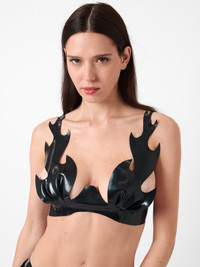 Introducing our flamin' hot Roast Bra. This ultra shine bra top features flame details, adjustable spaghetti straps and a hook and eye bra fastening at the back. Pair with the Manhattan Skirt & Cruella Shoes in Patent Black for the complete look. Don't forget to use the latex wipe to give it that extra shine. - Ultra shine bra top - Hook & eye fastening at the back - Skinny adjustable straps - 100% latex - Model wears size XS - Model Height: 5'8.5" / 174cm