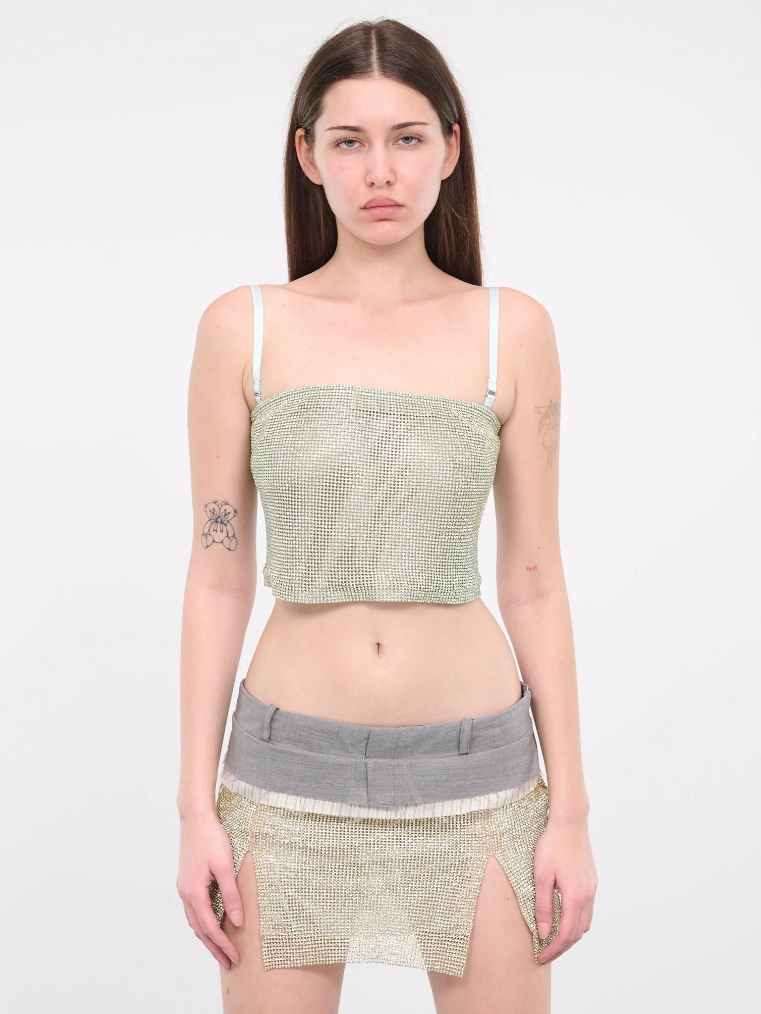 POSTER GIRL top in teal, chainmail top design, paneled chainmail construction, rhinestone-encrusted, straight neckline, adjustable spaghetti straps, sleeveless, armscyes, open back, back bungee drawstring fastening, straight hem, cropped length, slim fit. Made in London 50% Aluminum 50% Glass Standard Sizing Model is 5'10" wearing size S. Bust: 33" Waist: 24" Hips: 35"