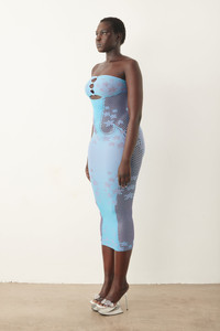 Indulge in luxury with our Roxie Dress in Crypto Blue. This midi bodycon dress boasts a sultry peephole and striking heart buttons, while the star motif adds a touch of whimsy. Elevate your wardrobe with this sophisticated and exclusive piece. As worn by Jordyn Woods to our SS24 Launch party. - Designed in London, Made in Italy - Sculpting hosiery shapewear - Star motive - Crystal Heart Buttons - Model Height: 5'10 1/2"/ 179.5cm