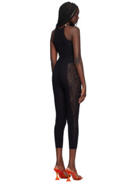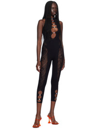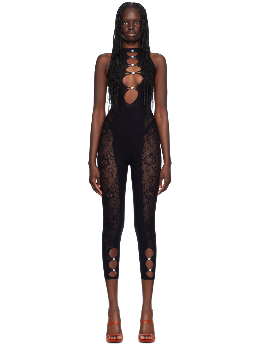 Semi-sheer stretch nylon jersey and mesh jumpsuit. Cutouts and jacquard floral pattern throughout. · Lettuce edge at crewneck · Crystal-cut graphic hardware at collar, front, and cuffs · Jacquard logo at back Wholesale exclusivity at SSENSE. Supplier color: Black floral 92% nylon, 8% elastane. Made in China 242770F070004