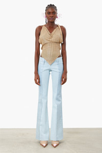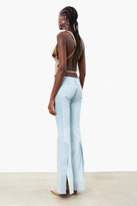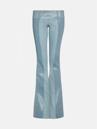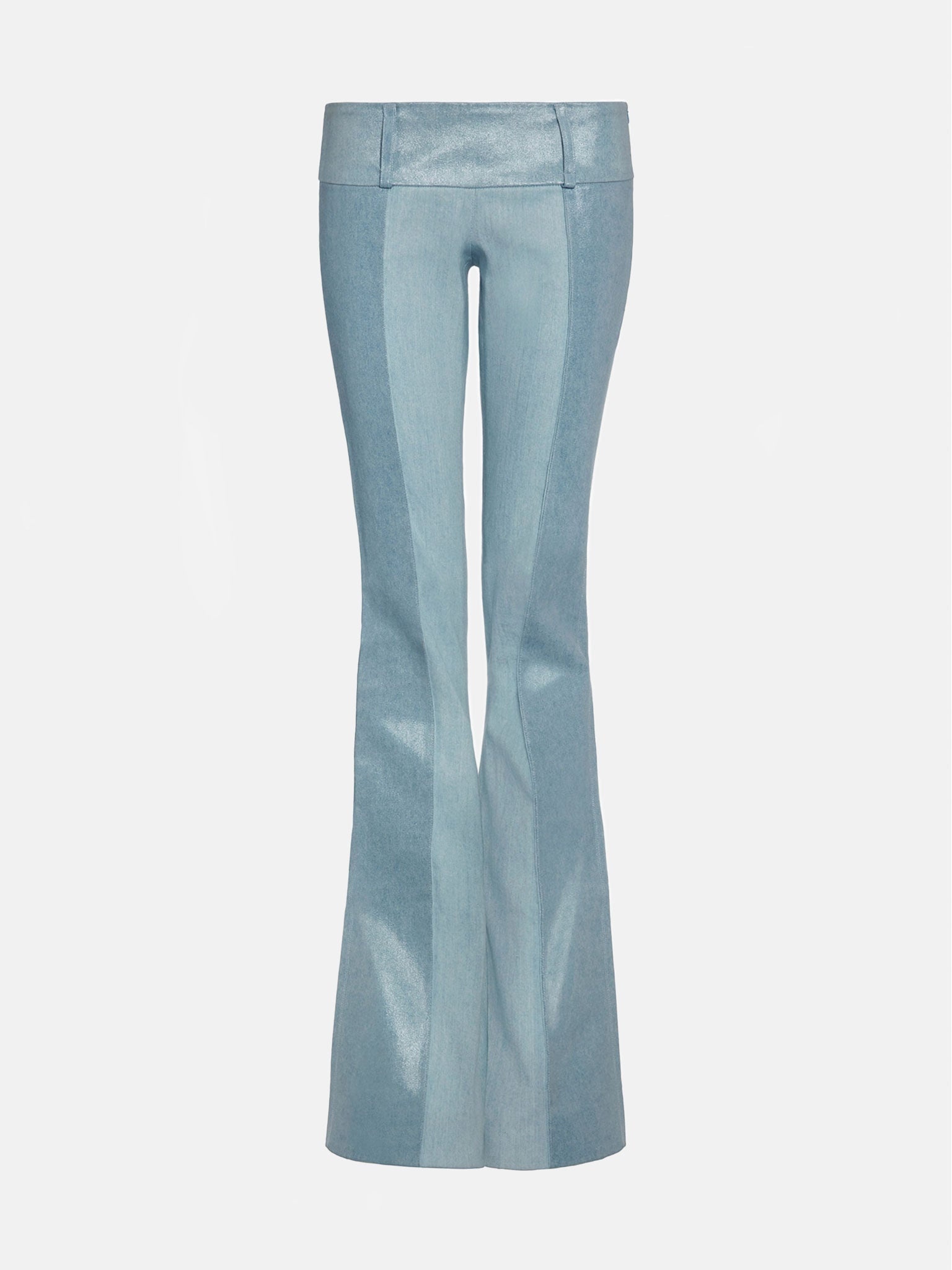 DESCRIPTION The Suzan Jeans mark our denim debut. Crafted in London in luxurious light blue cotton, the jeans feature panelled detailing in plain and wet look, that elongates the legs and hugs the hips. - Wet look coated denim - Low rise - Belt loops - Slim fit to flared hem - Panelled design COMPOSITION AND CARE 100% Cotton Wet look treated with polyurethane Dry clean only Do not bleach Do not tumble dry Do not iron