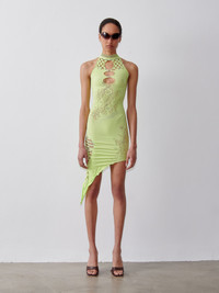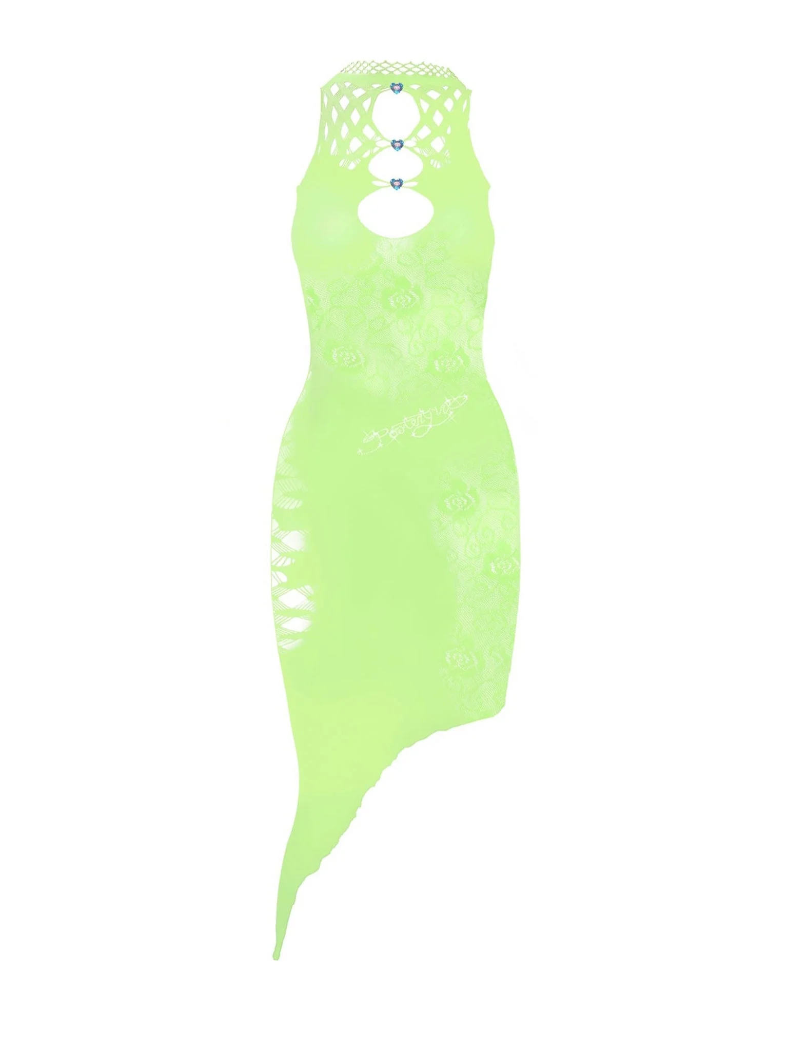 POSTER GIRL's iconic Tamika Dress features psychedelic swirl lace and signature cutouts. Crystal heart embellished details and a frilly hemline make this control dress a real head-turner. POSTER GIRL's shapewear category is designed to suction you in all the right places, releasing and supporting your natural curves where needed. - The dress is one size fits most ( UK 6 - 22 ) - 98% Nylon 2% Spandex - Model Height: 5'9"/ 175cm
