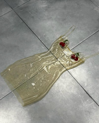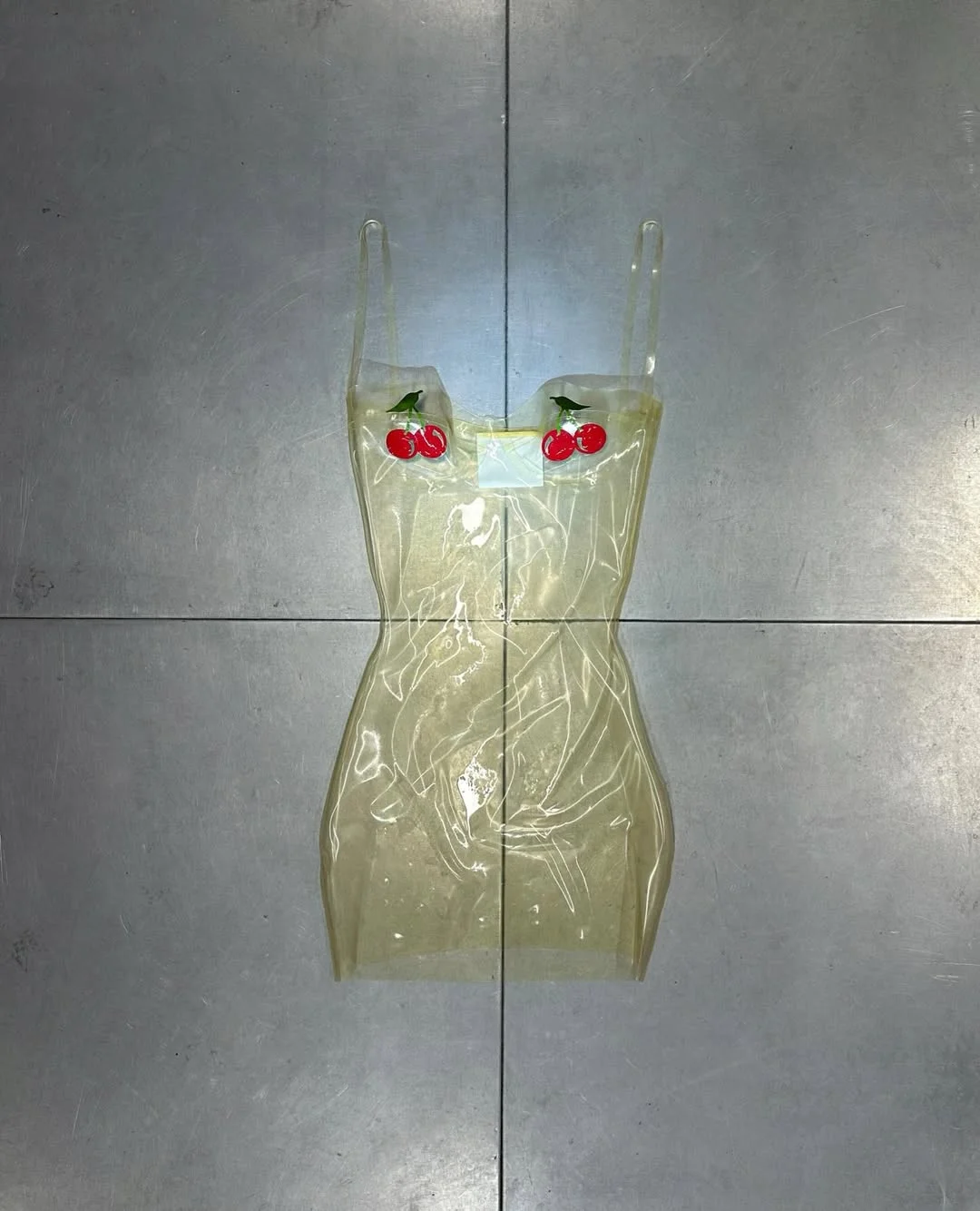 The Invisible Dress in Cherry, featuring hand-appliqued cherries for tasteful coverage. This iconic piece captured global attention, going viral with over 80 million views. Crafted from our signature crystal-clear latex, this fully sheer statement piece is designed to sculpt the body and steal the spotlight. Care and wear instructions provided. Use the latex wipe to give it that extra shine. Fits true to size. - Handcrafted in the UK - 100% latex - Pull on style, no zipper *excludes undergarments