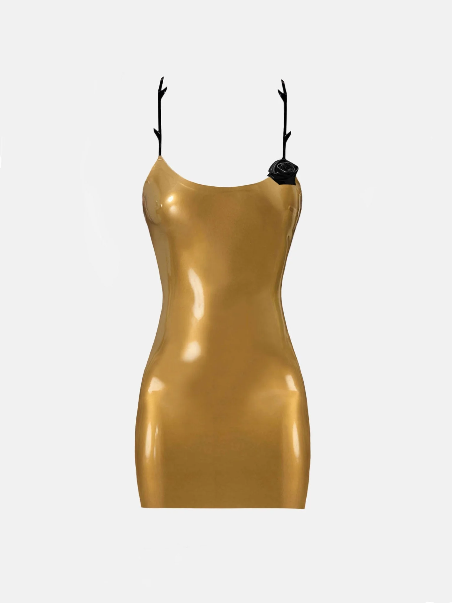 Introducing the Thorn dress as part of our exclusive latex holiday collection. Crafted in a shiny gold latex, this fantastical mini dress features a low plunging backline with a tie-up corset detail with diligently designed thorns and roses along the back ties and shoulder spaghetti straps. The Thorn dress also has been designed with a cowl ruched neckline & a delicately positioned black latex rose at the side. Pair with the Ursula Mules Patent Leather in Black for the complete look. Don't forget to use the latex wipe to give it that extra shine. - Ultra shine - Low plunging backline - Intricate tie-up corset back detail - Black latex roses & thorn detailing - 100% Latex - Model wears size XS - Model Height: 5'9.5"/ 176cm