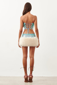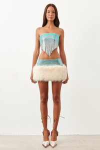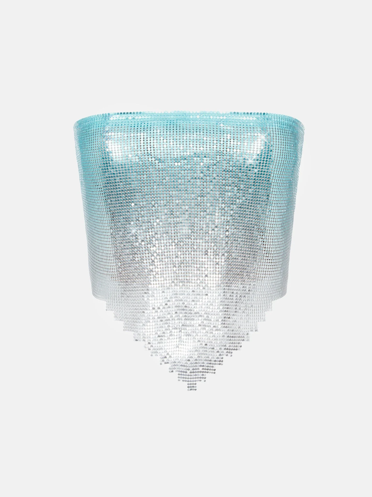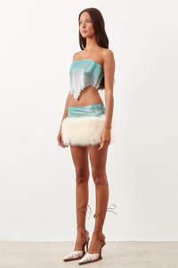 The Tia Top is brand new for AW23, inspired by our best selling Brooke Bra. Hand crafted in London with Ombre chainmail, it features a lace up back and an intricate hand cut stepped symmetrical hem. Fully lined with logo stretch mesh. Pair with the Clyde Fur Skirt Ombre to make a statement. - Made from luxurious aluminium metal with a stretch lining - Fully lined with logo stretch mesh - Strapless Top - Outer: 100% Aluminium micro metal mesh - Lining: 93% Polyamide 7% elastane - Model Height: 5'7" / 170cm and wears size S Each chainmail piece is constructed by hand in London. Chainmail is unlike most fabrics so it is important to take care when trying on. Chainmail ranges from XS-XL and does not stretch. Never force the garment on otherwise the chainmail will rip. If you are in-between sizes, we recommend sizing up. COMPOSITION & CARE - Outer: - 100% Aluminium - Lining: - 93% Polyamide 7% Elastane - Fur: - 100% Polyester