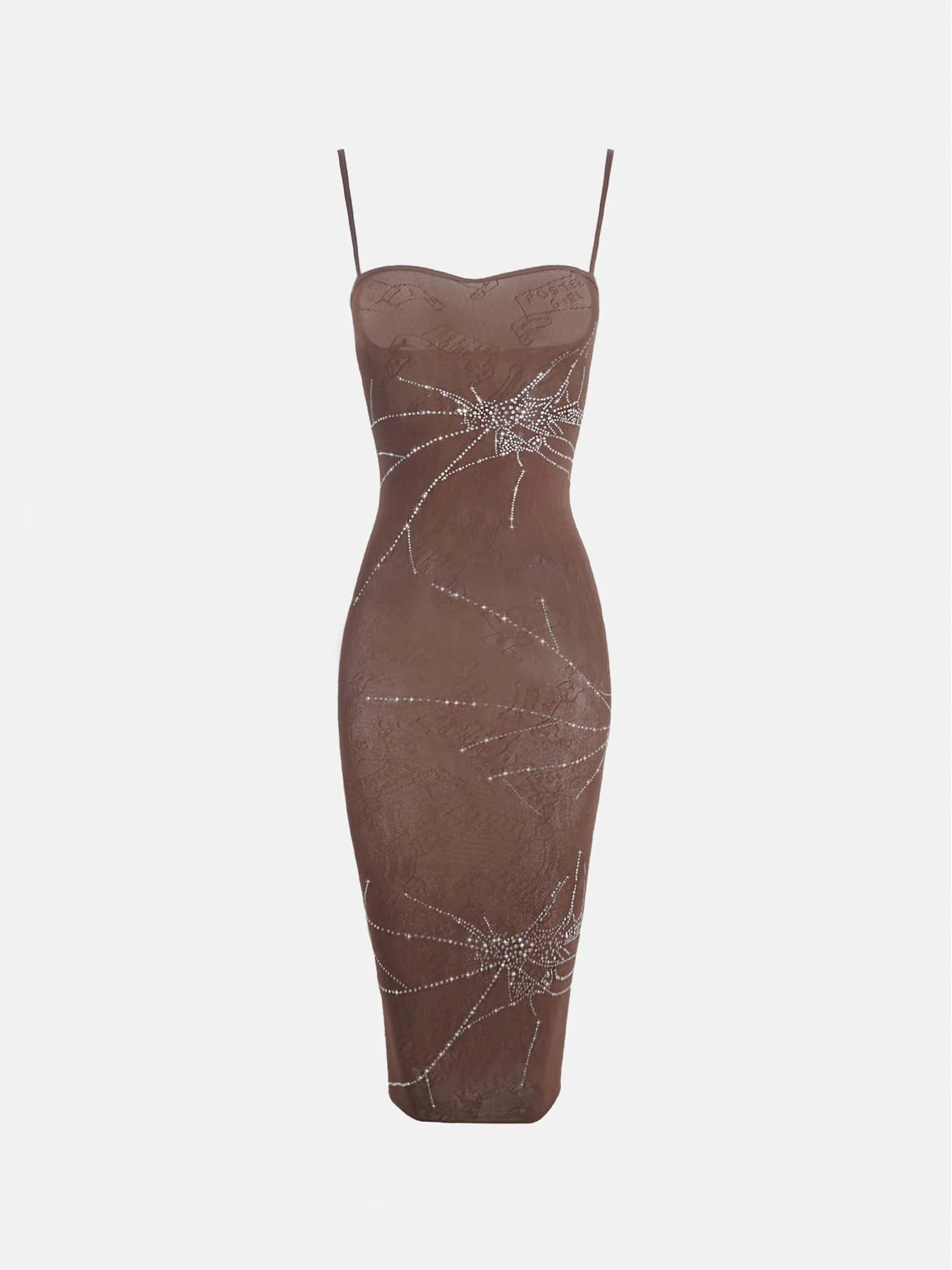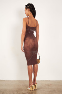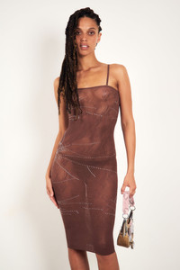 This Vanderbeck Dress is the perfect combination of fashion-forward glam and comfortable shapewear. It's designed to follow your body's curves while flattering your shape, all in a sophisticated old money brown colour accented with rhinestones and featuring POSTER GIRL in a scroll motif. A must-have for any wardrobe! - Spaghetti straps - Designed in London, Made in Italy - Cracked glass rhinestone design - Sculpting hosiery shapewear - 88% Polyamide, 12% Elastane - Model is 5"10 /178cm