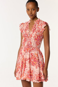 The Mini Dress Callie evokes elegance and romance as envisioned by Poupette St Barth. Delicate ruffles on the shoulders, highlighted with an eyelash finish, bring a signature romantic and refined touch. Braided cords adorn the bodice for a subtle graphic effect, while the ruffled skirt adds movement and lightness. A braided rope belt highlights the waist with charm, and covered buttons complete the piece with elegant details. Perfect for a feminine and sophisticated look on any occasion. Crafted with LENZING™ ECOVERO™ branded viscose fibers, derived from renewable wood sources for a lower environmental impact. LENZING™ and ECOVERO™ are trademarks of Lenzing AG. Shown here in the exclusive Pink Exotic Forest pattern, hand-printed with screen frames. Christelle wears a size S (US 4 / EU 36 / UK 8) and is 5'8" (179 cm) tall.