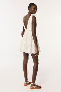 A romantic dress with adjustable shoulder bows and a plunging neckline, highlighted with lace fringes throughout. In the broderie anglaise style, the bust is adorned with pearls and sequins. Shown here in Natural White. Model wears a small size/US 4/EU 36/UK 8 and is 5'8/178cm tall.