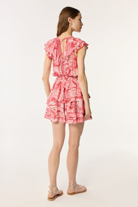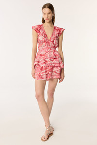 The Carol mini dress enchants with its V-neckline at the front and back, accentuated by smocked bands that structure the silhouette. The butterfly ruffles on the sleeves balance the delightful play of volume created by the skirt, which features overlapping asymmetrical ruffles outlined with contrasting openwork seams. Its detailed and delicate cut makes it a feminine and elegant piece, true to Poupette St Bartha€™s style. Crafted with LENZING™ ECOVERO™ branded viscose fibers, derived from renewable wood sources for a lower environmental impact. LENZING™ and ECOVERO™ are trademarks of Lenzing AG. Shown here in the exclusive Pink Tiger Lily pattern, hand-printed with screen frames. Nessie wears a size S (US 4 / EU 36 / UK 8) and is 5'9" (180 cm) tall.