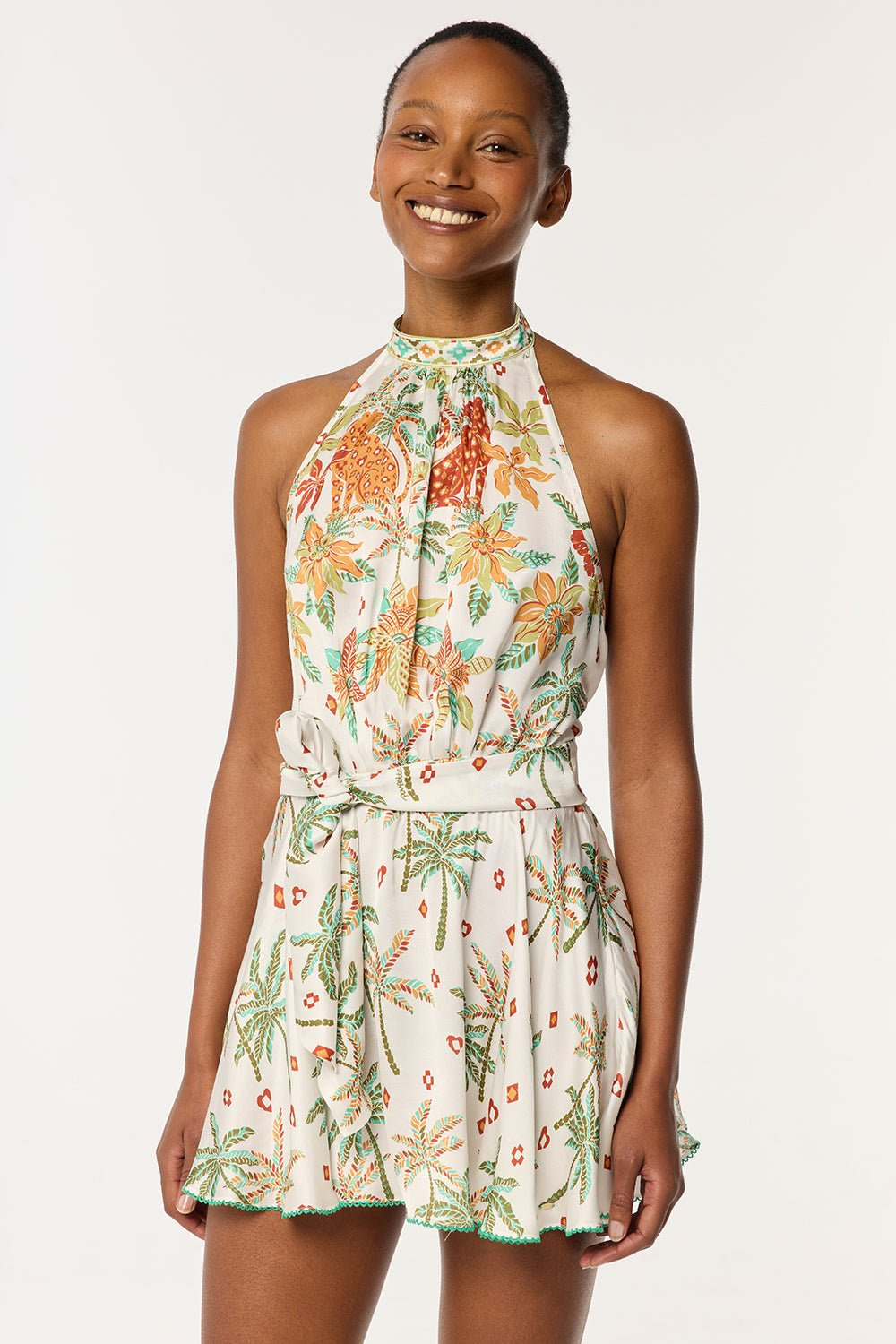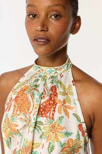 The Mini Dress Cassandra combines minimalism and femininity. Sleeveless and featuring a high neckline, it reveals an open back enhanced by two flowing fabric panels that delicately cross the back before cinching the waist. Crafted from lightweight and fluid material, this piece offers a sophisticated and airy look, perfect for summer days or elegant evenings. Crafted with LENZING™ ECOVERO™ branded viscose fibers, derived from renewable wood sources for a lower environmental impact. LENZING™ and ECOVERO™ are trademarks of Lenzing AG. Shown here in the exclusive Green Equator pattern, hand-printed with screen frames. Christelle wears a size S (US 4 / EU 36 / UK 8) and is 5'8" (179 cm) tall.