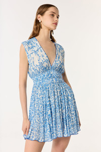 The Mini Dress Ciao, sleeveless, stands out with its fully pleated top accented with piping. Embroidery subtly embellishes the neckline and hem of the dress. Contrasting lines structure the top of the dress, achieving a perfect balance between modernity and delicacy. A chic and timeless Poupette St Barth piece, ideal for sunny days or special occasions. Crafted with LENZINGa„¢ ECOVEROa„¢ branded viscose fibers, derived from renewable wood sources for a lower environmental impact. LENZINGa„¢ and ECOVEROa„¢ are trademarks of Lenzing AG. Shown here in the exclusive Blue Lazuli pattern, hand-printed with screen frames. Nessie wears a size S (US 4 / EU 36 / UK 8) and is 5'9" (180 cm) tall.