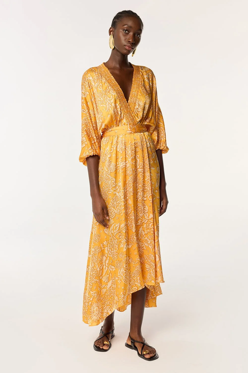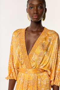 The summer season calls for elevated looks and Long Dress Celie is one of them. With a cross over, wrap-inspired design, it is held together at the waist and features wide kimono-style sleeves, together with a textured band along the neckline. A flowy and lengthy piece, this dress is an elegant show stopper. Shown here in Yellow Oriental Foulard. Our Viscose is certified eco-responsible. Model wears a small size/US 4/EU 36/UK 8 and is 5'8/ 178cm tall.