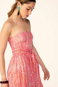 Long dress in cotton metallic Fully lined Picot trimming on hemline Detachable self-fabric belt with zigzag trimming and belt loops Smocked back Strapless design Side pockets Each piece is crafted from an exclusive print, hand-applied using traditional, time-honored techniques. This rare artisanal expertise results in slight color variations, a hallmark of the unique character of every creation. Victoria wears a size S (US 4 / EU 36 / UK 8) and is 5'8" (172 cm) tall. Poupette St Barth - Your Styles
