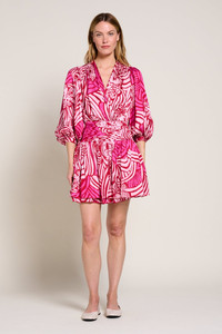 Mini dress in viscose satin Gathered crossover top with metal hook closure Puff sleeves Pleated waistband with smocked back Two-layer gathered skirt Picot trimming on neckline and hem Buttoned cuffs with covered buttons Crafted with LENZING™ ECOVERO™ branded viscose fibers, derived from renewable wood sources for a lower environmental impact. LENZING and ECOVERO are trademarks of Lenzing AG. Each piece is crafted from an exclusive print, hand-applied using traditional, time-honored techniques. This rare artisanal expertise results in slight color variations, a hallmark of the unique character of every creation. Emily wears a size S (US 4 / EU 36 / UK 8) and is 5'10" (178 cm) tall. Poupette St Barth - Your Styles