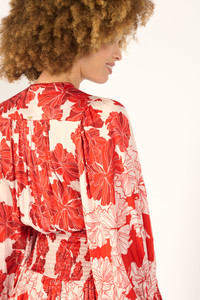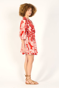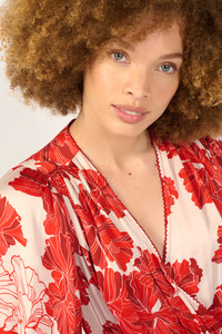 Mini dress in viscose satin Gathered crossover top with metal hook closure Puff sleeves Pleated waistband with smocked back Two-layer gathered skirt Picot trimming on neckline and hem Buttoned cuffs with covered buttons Crafted with LENZING™ ECOVERO™ branded viscose fibers, derived from renewable wood sources for a lower environmental impact. LENZING™ and ECOVERO™ are trademarks of Lenzing AG. Each piece is crafted from an exclusive print, hand-applied using traditional, time-honored techniques. This rare artisanal expertise results in slight color variations, a hallmark of the unique character of every creation. Aurelie wears a size S (US 4 / EU 36 / UK 8) and is 5'9" (175 cm) tall. Poupette St Barth - Your Styles