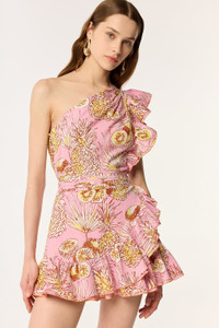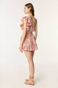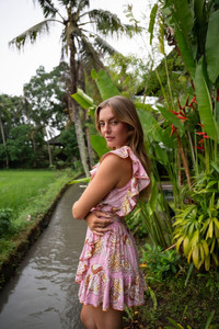 The Corinne mini dress stands out with its asymmetrical design and romantic ruffles on one shoulder in a butterfly sleeve style. The comfortable waistband, pleated at the front and smocked at the back, accentuates the silhouette. The ruffle at the bottom of the skirt rises delicately toward the sleeve, creating a captivating visual curve. Signed by Poupette St Barth, the Corinne is perfect for a bold and elegant look, whether for special occasions or beautiful summer evenings. Shown here in the exclusive Pink Karibia pattern, hand-printed with screen frames. Nessie wears a size S (US 4 / EU 36 / UK 8) and is 5'9" (180 cm) tall.