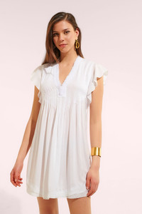 Mini Dress Sasha is a Poupette St Barth classic with a vibrant fringed collar, flutter sleeves and lace trim at the hem. Its trapeze shape can be adjusted with a belt for a refined look. Ideal for a casual and cool beach style. Shown here in Optic White. Our Viscose is certified eco-responsible. Model wears a small size/US 4/EU 36/UK 8 and is 5'10/ 178 cm tall. Composition 100% VISCOSE PLAIN. Hand wash cold. Hang to dry.