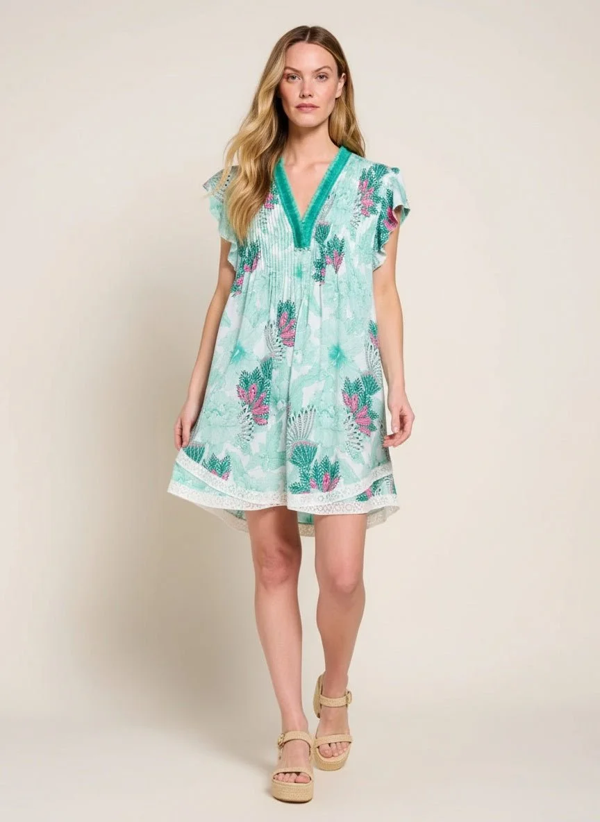 Mini dress in viscose Pleated front and back A-line shape Beaded neckline with fringes trimming Lace trim on hem Crafted with LENZING™ ECOVERO™ branded viscose fibers, derived from renewable wood sources for a lower environmental impact. LENZING and ECOVERO are trademarks of Lenzing AG. Each piece is crafted from an exclusive print, hand-applied using traditional, time-honored techniques. This rare artisanal expertise results in slight color variations, a hallmark of the unique character of every creation. Emily wears a size S (US 4 / EU 36 / UK 8) and is 5'10" (178 cm) tall. Poupette St Barth - Your Styles