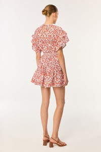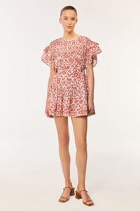 The mini skirt Chantal stands out for the attention to detail, emblematic of Poupette St Barth. Its waistband, with an asymmetrical horizontal cut, is adorned with a delicate decorative bow. The skirta€™s flounce is enhanced with openwork stitching and a lace-trimmed hem. The smocked back ensures an easy fit and flatters the silhouette. Versatile, the Chantal skirt pairs effortlessly with a simple top or a matching piece from the same print. It embodies a perfect balance of casual elegance. Shown here in the exclusive Pink Victorian pattern, hand-printed with screen frames. Kallin wears a size S (US 4 / EU 36 / UK 8) and is 5'8" (179 cm) tall.