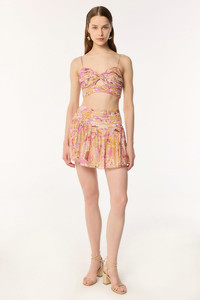 The mini skirt Colleen is perfectly suited for summer events, beach getaways, or city strolls. Its waistband, decorated with horizontal pleats at the front, and its hem delicately finished with refined lace, lend it an elegant touch. With its short cut and modern design by Poupette St Barth, it accentuates the legs and offers a fresh and dynamic look. Versatile, the Colleen skirt can be worn with a simple top or paired with a matching print for a harmonious and feminine ensemble. Shown here in the exclusive Pink Mosaic pattern, hand-printed with screen frames. Nessie wears a size S (US 4 / EU 36 / UK 8) and is 5'9" (180 cm) tall.