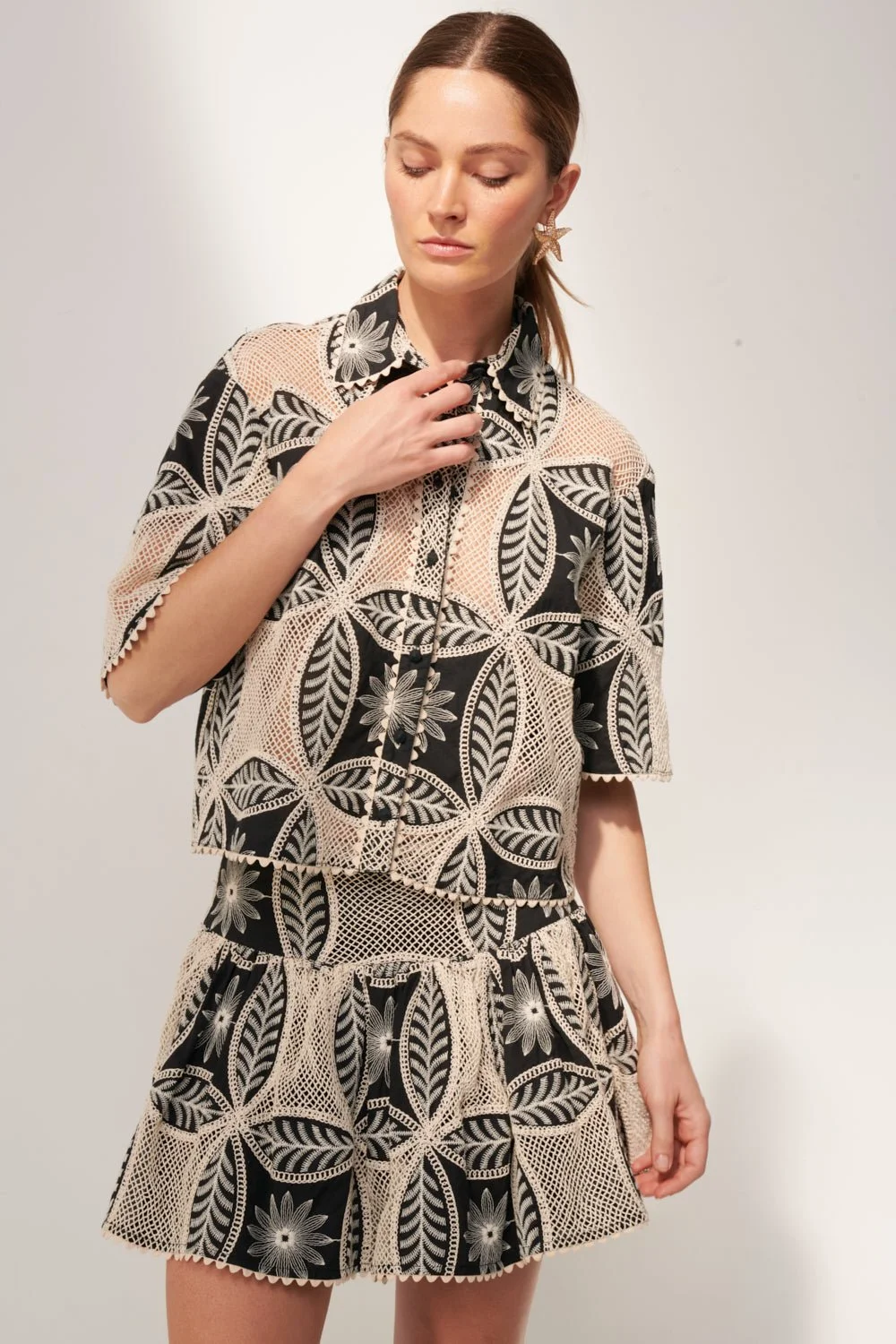 Shirt in cotton eyelet Mandala Cropped style with classic collar Zigzag lace on hem, cuffs, and collar Covered buttons with full front placket Each piece is crafted from an exclusive print, hand-applied using traditional, time-honored techniques. This rare artisanal expertise results in slight color variations, a hallmark of the unique character of every creation. Victoria wears a size S (US 4 / EU 36 / UK 8) and is 5'8" (172 cm) tall. Poupette St Barth - Your Styles
