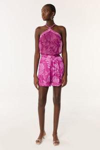 The Isabelle short stands out with its fluid viscose satin fabric and its elegant cut. Italian pockets add practicality, while the hem, delicately outlined with cross-stitching, provides a subtly refined touch. Signed by Poupette St Barth, the Isabelle short embodies a casual chic style, perfect for a sophisticated summer look. Crafted with LENZING™ ECOVERO™ branded viscose fibers, derived from renewable wood sources for a lower environmental impact. LENZING™ and ECOVERO™ are trademarks of Lenzing AG. Shown here in the exclusive Purple Macro Stelis pattern, hand-printed with screen frames. Diarra wears a size S (US 4 / EU 36 / UK 8) and is 5'8" (178 cm) tall.