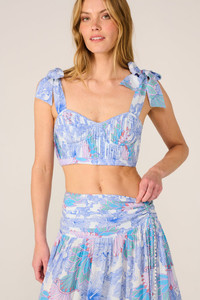 Top in viscose with a corset-style cropped fit Large gold hook on strap Fully pleated Internal boning and smocked back for structure and comfort Crafted with LENZING™ ECOVERO™ branded viscose fibers, derived from renewable wood sources for a lower environmental impact. LENZING and ECOVERO are trademarks of Lenzing AG. Each piece is crafted from an exclusive print, hand-applied using traditional, time-honored techniques. This rare artisanal expertise results in slight color variations, a hallmark of the unique character of every creation. Emily wears a size S (US 4 / EU 36 / UK 8) and is 5'10" (178 cm) tall. Poupette St Barth - Your Styles