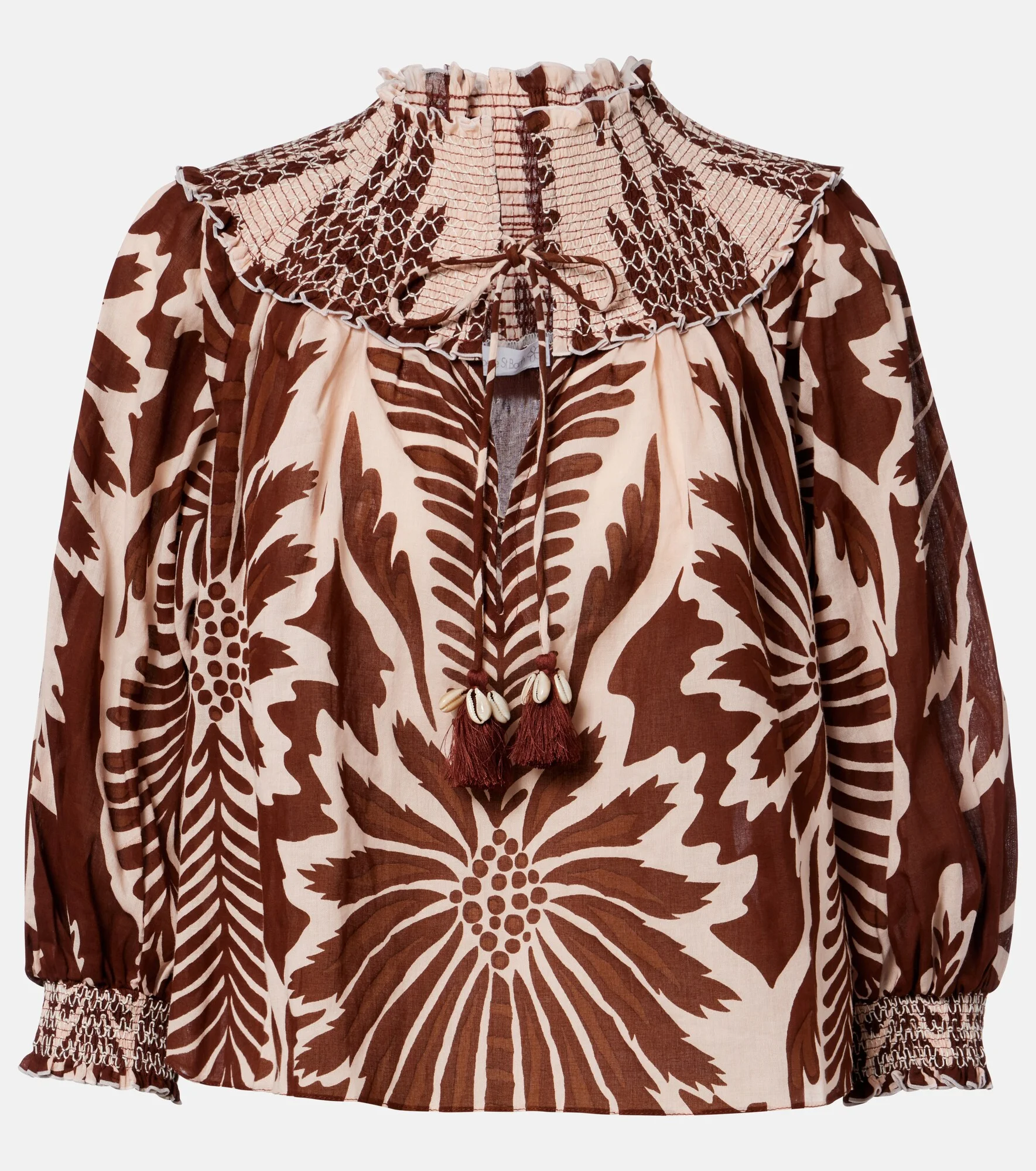 Center your vacation wardrobe around Poupette St Barth's beautifully breezy styles. Carefully crafted from cotton, the Ysee blouse features a self-tie neckline, smocked detailing, and an all-over print. Product Details - Material: 100% cotton - Care instructions: hand wash - Made in Indonesia - Color: brown - Designer color name: Brown Cartagena - Cuff: elasticated - Item number: P01170711 Size & Fit - True to size - Designed for a loose fit - Non-stretchy fabric - Slightly cropped - The model seen in the picture is 178cm-5'10" and wearing a size XS