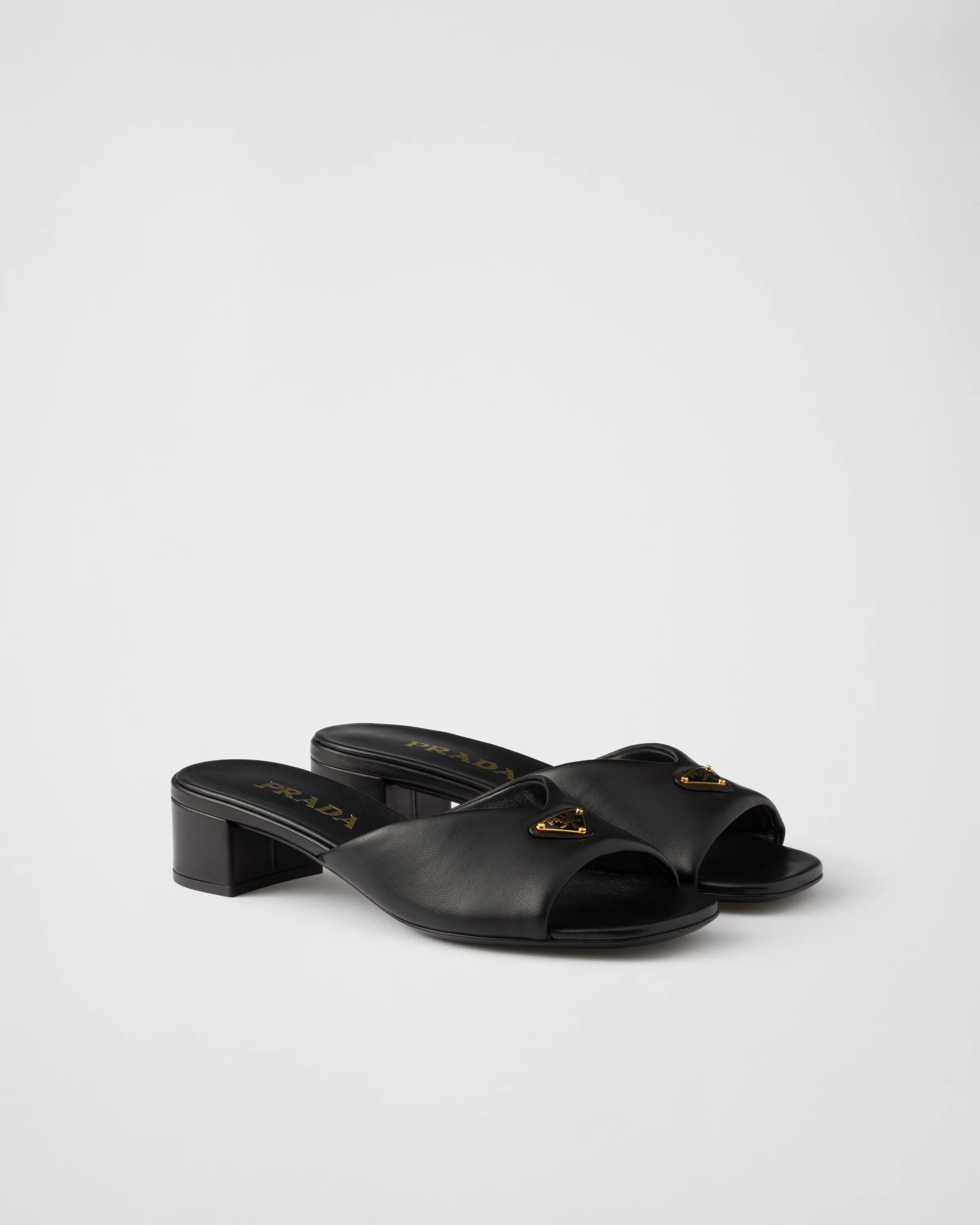 These sandals, characterized by a refined and versatile style, are made of padded nappa leather that emphasizes the clean, contemporary lines of the design. The enameled metal triangle logo embellishes the style. - Product code: 1XX711_2DL8_F0002_F_A035 - Enameled metal triangle logo - Leather sole with metal lettering logo - Leather-covered heel, height 35 mm - Imported MATERIALS Main material: Lambskin