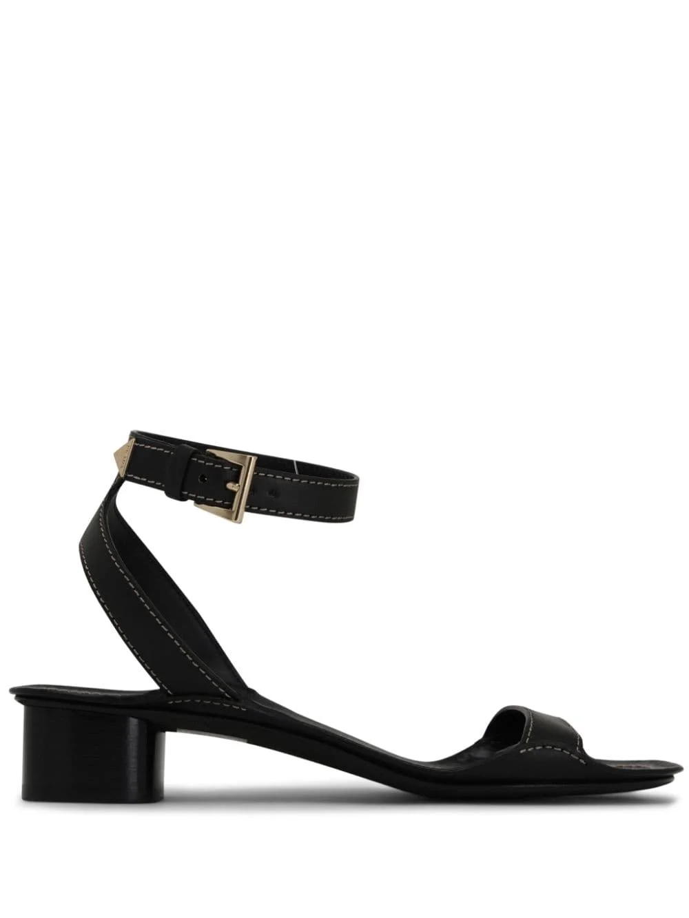 35mm triangle-logo leather sandals Highlights - Black - Calf leather - Triangle logo - Gold-tone hardware - Contrast stitching - Square open toe - Buckle-fastening ankle strap - Single toe strap - Branded footbed - Low block heel - Leather sole Composition Sole: Calf Leather 100% Outer: Calf Leather 100% Lining: Calf Leather 100% SIZE & FIT Measurement HEEL 1.37 in(3.5 cm)