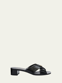 These mule sandals by Prada are crafted from metallic calf leather and topped with the iconic enameled triangle logo hardware 1.25 in / 35 mm wrapped block heel Open toe Crisscross vamp straps Slide style Leather lining and outsole Made in Italy