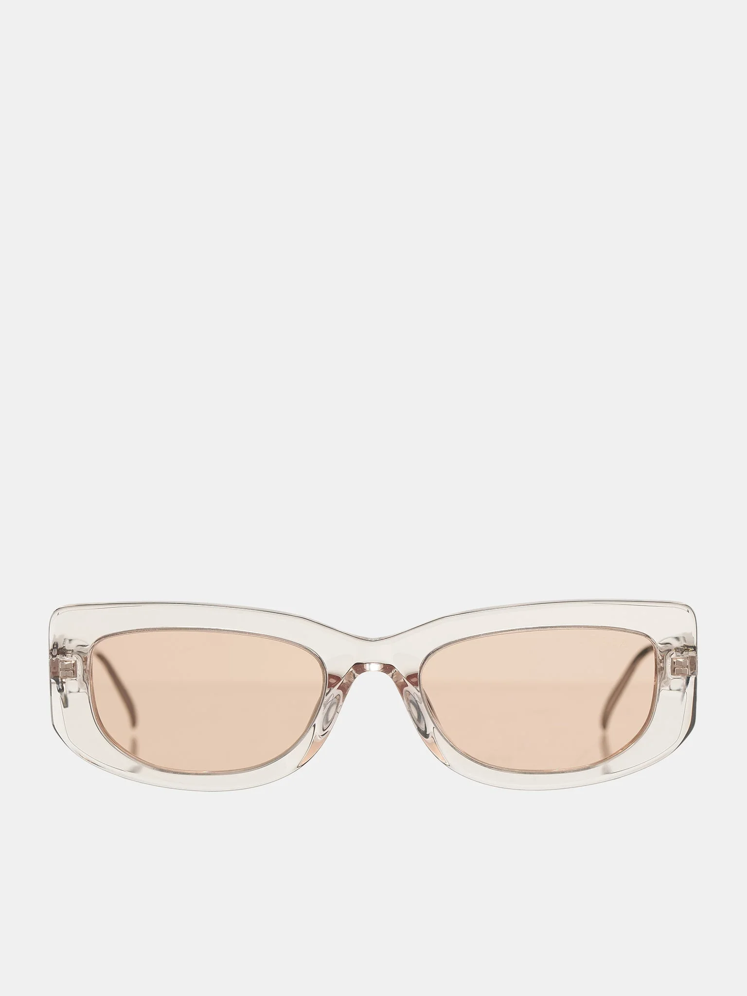 PRADA sunglasses in clear & beige, acetate & nylon construction, rectangular frame design, transparent, beige-tinted lenses, temple cut-outs & logo detailing, fixed nose pads, case included. Imported Acetate & Nylon One Siza
