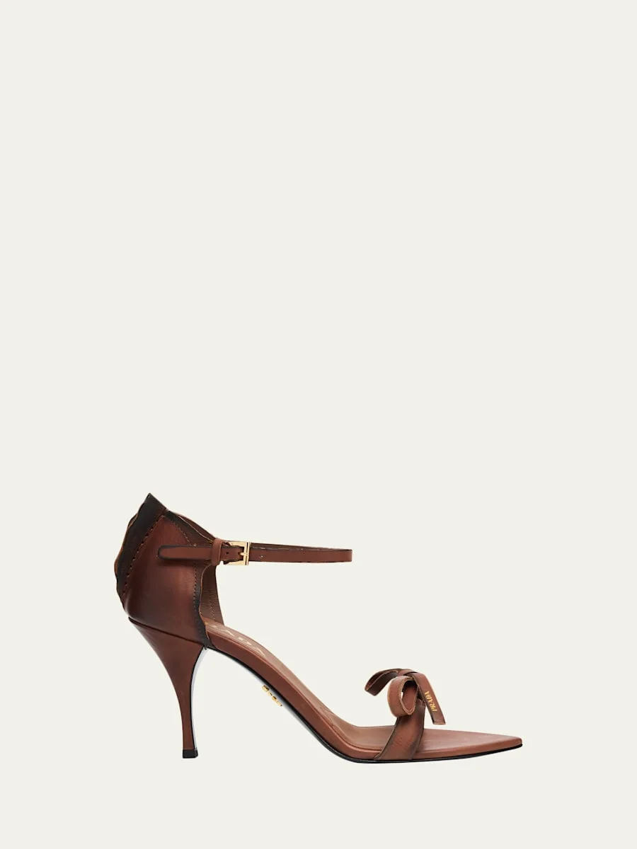 Complete with an antiqued effect, visible stitching, and raw-cut edges, these sandals by Prada are crafted from calfskin leather for an intentionally unfinished design 3.25 in / 85 mm covered stiletto heel Pointed open toe Adjustable ankle buckle strap Leather lining Rubber outsole Professional cleaning recommended Made in Italy Online Inquiries: BGS21_X6YKD| Store Inquiries: #5057171